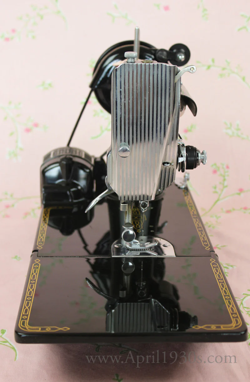 We are very excited to add this lovely "Red S" Featherweight 221K to the site. Completely serviced, cleaned, polished, electrically inspected, timed, tuned and sampled - rest assured, this Featherweight 221 will be ready to sew right out of the case. Powerful original 110v motor with a quiet, smooth stitch. Many of you might be wondering, "what does the "K" mean after the 221?" That 'K' simply means the machine was manufactured at the Kilbowie, Clydebank, Scotland SINGER plant. During the last three years of production of the black Singer Featherweights (1959-1961), a "Red S" emblem was issued rather than the standard gold-colored badge.