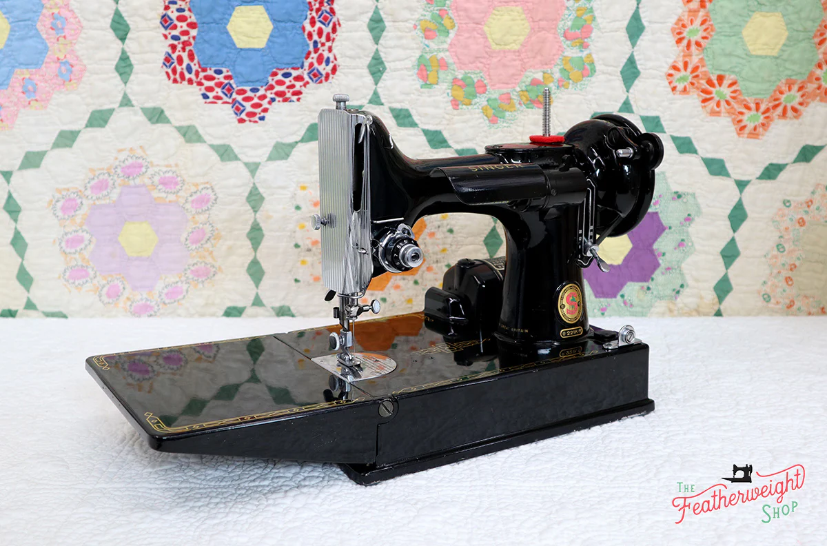 We are very excited to add this lovely "Red S" Featherweight 221K to the site. Completely serviced, cleaned, polished, electrically inspected, timed, tuned and sampled - rest assured, this Featherweight 221 will be ready to sew right out of the case. This machine is fitted with an original 110-volt motor that has been rewound to work at optimum speed and torque, so you can plug it in and begin sewing with effortless power.  Many of you might be wondering, "what does the "K" mean after the 221?" That 'K' simply means the machine was manufactured at the Kilbowie, Clydebank, Scotland SINGER plant. During the last three years of production of the black Singer Featherweights (1959-1961), a "Red S" emblem was issued rather than the standard gold-colored badge.