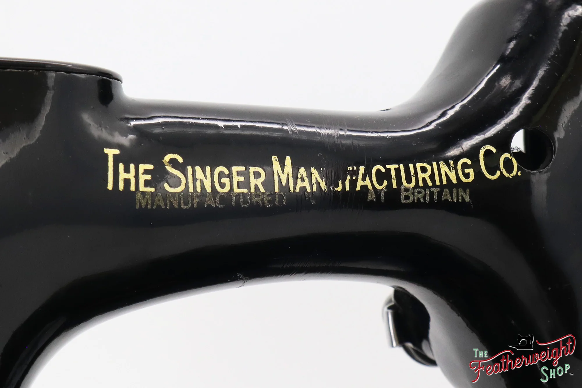 This Featherweight is distinguished by the 'Manufactured in Great Britain' decal on the back of the machine arm. A similar decal (composed in French) was frequently placed on 221 Featherweights sold in France. It is not clear why Singer added this origin country decal when a machine would be sold in the UK, but they are certainly rare and difficult to come by.