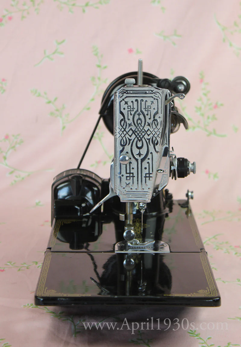 EF908*** indicates an original production commission date of July 19, 1950 and is given a Grade 8-. Be sure to click on any image far above to view the close-up details of this Singer Featherweight machine. It is in beautiful condition with the only flaws being a very small amount of wear on the decals a small pin scratch.
